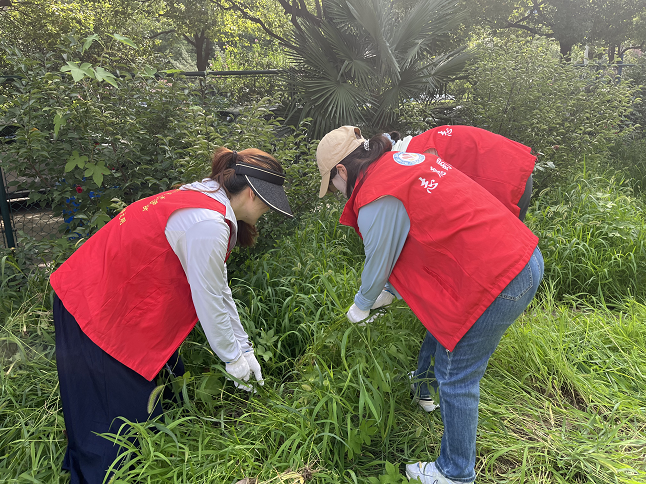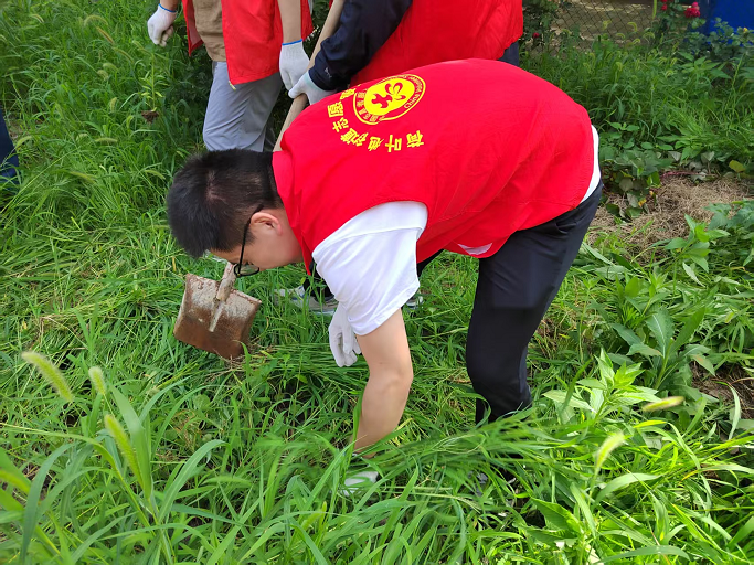 雖是清晨卻已烈日高懸,氣溫早早便飆升至高位,空氣里彌漫著灼人的熱氣,仿佛一切都被熱浪包圍。志愿者們頭戴草帽,手持鋤頭工具,迅速投入到除草工作中。社區(qū)草叢里,雜草叢生,蚊蟲環(huán)繞,半人高的雜草增添了清除的難度。然而,炎熱的氣溫和鋤草的難度并未擊退大家的熱情,汗水順著臉頰、脊背不斷滑落,浸濕了衣衫,卻澆不滅大家服務(wù)社區(qū)、服務(wù)人民群眾的初心。黨員們沖鋒在前,團員們緊隨其后,大家齊心協(xié)力,有的負(fù)責(zé)鏟除高草,有的彎腰清理草根,有的將雜草聚攏搬運。